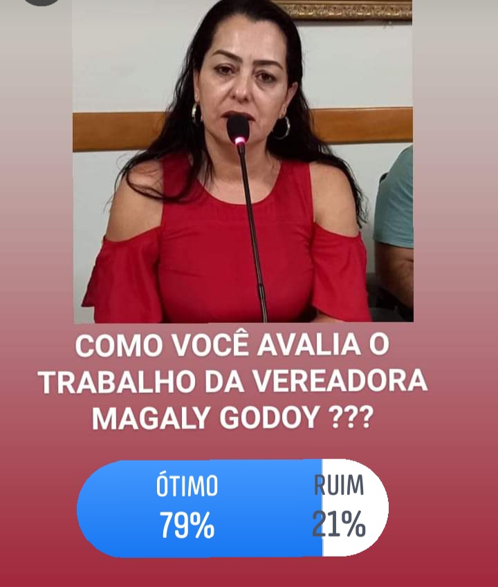 Em primeiro lugar ficou a vereadora Magaly Godoy com 79% acham ÓTIMO o trabalho da vereadora e 21 acham RUIM .