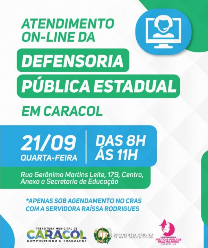 Em parceria com a Prefeitura de Caracol, a Defensoria Pública Estadual estará realizando atendimento on-line para a população do município no dia 21 de setembro.