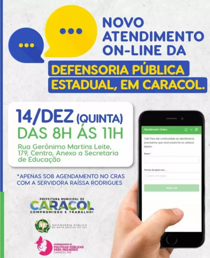 Um parceria com a Prefeitura de Caracol, a Defensoria Pública Estadual estará realizando atendimento on-line para a população do município no dia 14 de dezembro.