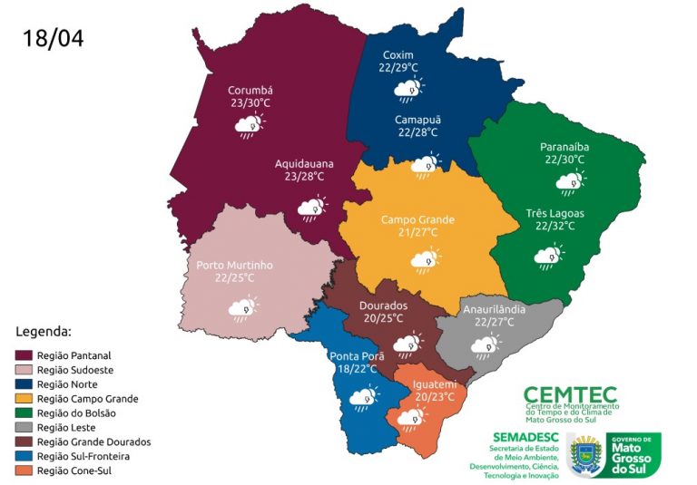 Segundo o Cemtec (Centro de Monitoramento do Tempo e do Clima), em Campo Grande, a temperatura mínima será de 21°C e a máxima de 27°C. Em Dourados, mínima de 20ºC e máxima de 25°C. No Sul, onde as temperaturas serão as menores do Estado, Ponta Porã terá mínima de 18°C e máxima de 22°C e Iguatemi aguarda por mínima de 20°C e máxima de 23°C.