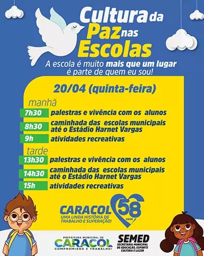 A Prefeitura de Caracol, por meio da Secretaria Municipal de Educação, Esporte, Cultura e Lazer (SEMED), realiza nesta quinta-feira, 20 de abril, data em que se comemora o Dia da Compaixão, do Amor e da Gratidão, uma ação de cultura de paz nas escolas.