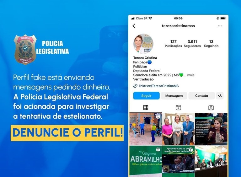 “Informamos que um perfil fake está enviando mensagens pedindo dinheiro. A Polícia Legislativa Federal foi acionada para investigar a tentativa de estelionato”, denunciou.