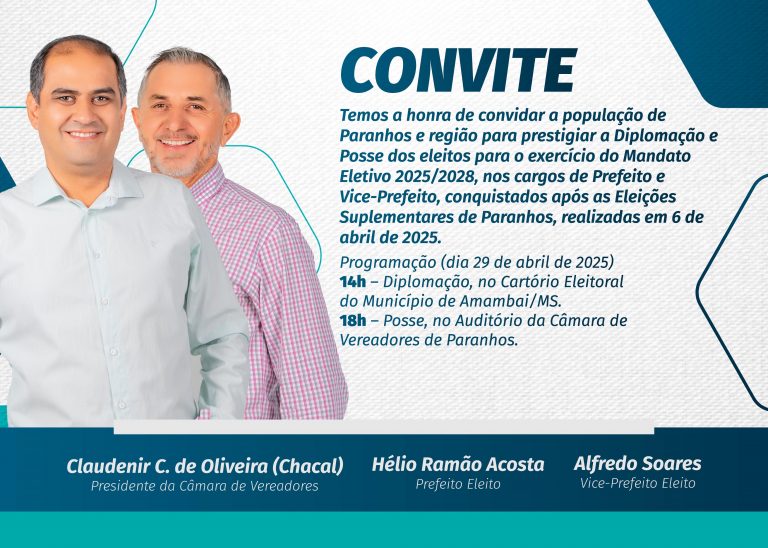A Câmara Municipal e a Prefeitura de Paranhos têm a honra de convidar toda a população do município e da região para prestigiar a solenidade de diplomação e posse dos eleitos para o exercício do mandato 2025/2028 nos cargos de prefeito e vice-prefeito, eleitos nas Eleições Suplementares realizadas no dia 6 de abril. O prefeito eleito é Hélio Ramão Acosta, tendo como vice-prefeito Alfredo Soares.