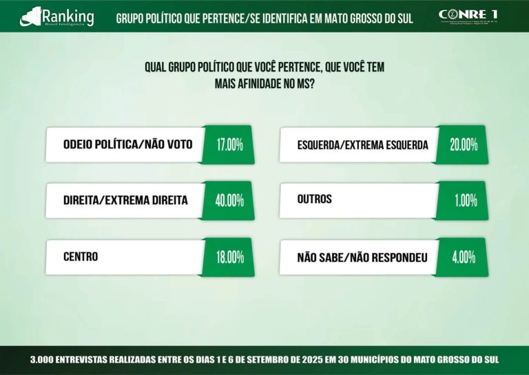 Pesquisa divulgada nesta segunda-feira em Mato Grosso do Sul mostra a direita ou extrema direita com o dobro da preferência dos eleitores que se classificam como de esquerda ou extrema esquerda em Mato Grosso do Sul.