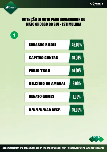 Pesquisa divulgada nesta segunda-feira, com intenções de voto para o Governo de Mato Grosso do Sul, mostra Eduardo Riedel (PP) na liderança para a eleição do próximo ano. O atual governador vence todos os cenários pesquisados, mas adversários se aproximam de levar para o segundo turno.