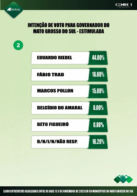 No segundo cenário pesquisado, Riedel tem 44% das intenções de votos; seguido por Fábio Trad, com 16%; Marcos Pollon, com 15%; Delcídio do Amaral, com 8%, e Beto Figueiró (Novo), com 0,8%. Outros 16,2% não sabem, não responderam, não votariam em nenhum deles ou votariam em branco.