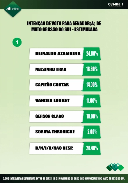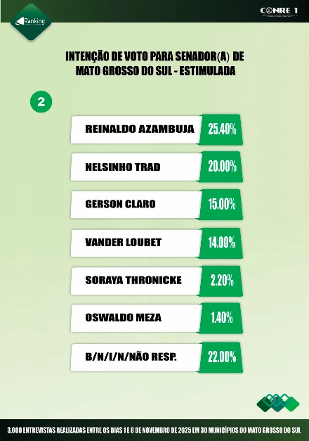 Segundo o Instituto Ranking, no primeiro cenário pesquisado, Reinaldo tem 24% das intenções de votos, seguido por Nelsinho Trad, com 18,6%; Capitão Contar, com 14%; Vander Loubet, 11%; Gerson Claro, com 10%; e Soraya Thronicke, com 2%. Outros 20,4% dos entrevistados não sabem, não responderam, não votariam em nenhum deles ou votariam em branco.