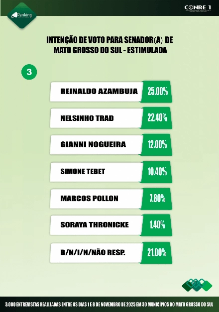 No terceiro cenário, Azambuja tem 25%; seguido por Nelsinho, com 22,4%; Gianni Nogueira, com 12%; Simone, com 10,4%; Marcos Pollon, com 7,8%; e Soraya Thronicke, com 1,4%. Outros 21% não sabem, não responderam, não votariam em nenhum deles ou votariam em branco.
