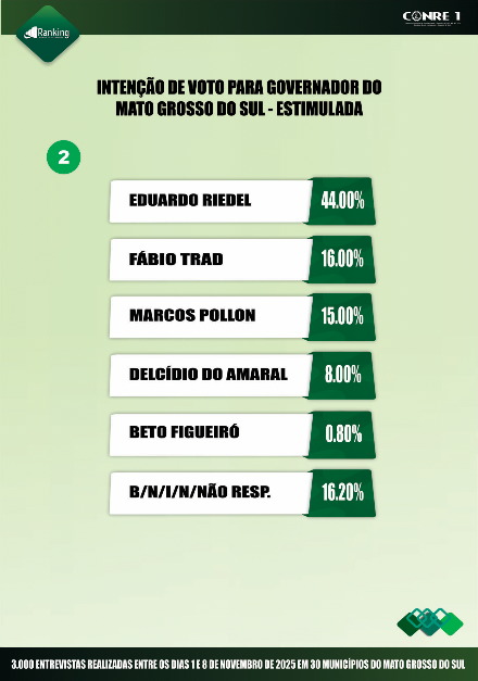 Uma pesquisa eleitoral divulgada nesta segunda-feira (10) mostra o governador Eduardo Riedel (PP) na liderança das intenções de voto para as eleições de 2026 em Mato Grosso do Sul. Em diferentes cenários analisados, o chefe do Executivo aparece com índices que variam entre 43% e 45%.