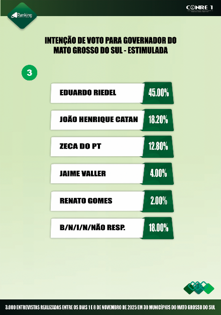 No terceiro cenário, Riedel atinge 45% das intenções, enquanto João Henrique Catan soma 18,2%, Zeca do PT aparece com 12,8%, Jaime Valler com 4% e Renato Gomes com 2%. Cerca de 18% dos entrevistados afirmaram não ter decidido ou preferem votar em branco.