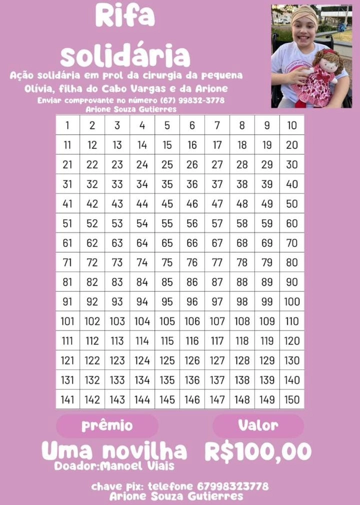 Ajude a pequena Olívia ,filha do Cabo Vargas e da Arione comprando um número da Rifa solidária.