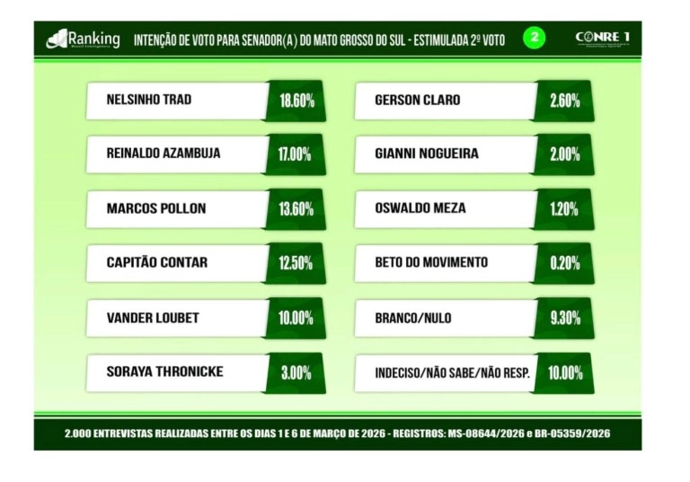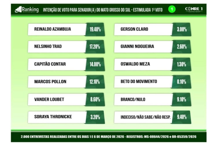 Pesquisa divulgada neste domingo, com intenções de voto para o Senado, indica Reinaldo Azambuja na liderança por uma das duas vagas, seguido de perto por Nelsinho Trad, e por Capitão Contar e Marcos Pollon, que aparecem no segundo bloco.