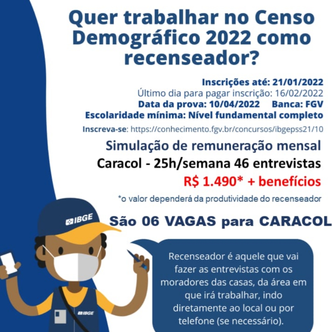 VAGAS CENSO DEMOGRÁFICO 2022 EM CARACOL.