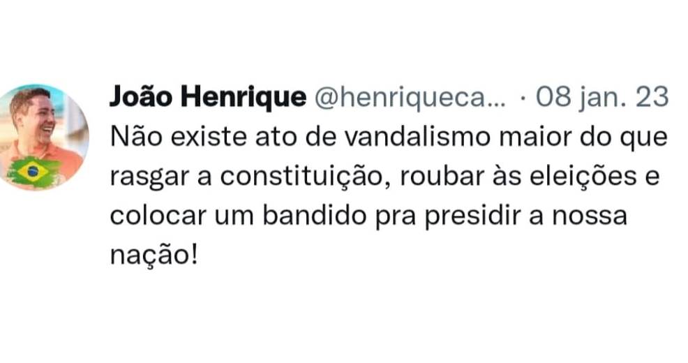 “Você que vai vir aqui desferir ofensas aos cidadãos brasileiros, que pacificamente se manifestaram contra o atual regime, pessoas que exerceram seu direito constitucional, que apoiam ao presidente Bolsonaro, e que diferente de vocês que são simpatizantes ou adeptos ao crime, estejam cientes que responderão civil e penalmente por isso.”