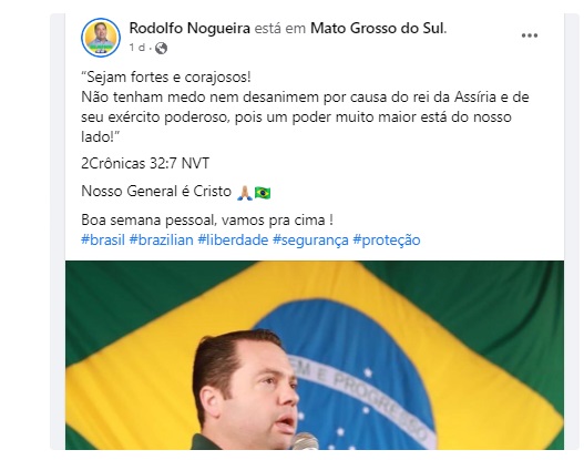 Eleito deputado federal, Gordinho do Bolsonaro ou Rodolfo Nogueira, que é agropecuarista, em 15 de novembro do ano passado usou um texto bíblico do livro de 2 Crônicas, em postagem no perfil que mantém no Facebook, para estimular a movimentação de rua de manifestantes que questionam o resultado das urnas do dia 30 de outubro. Ele disse à imprensa que entregaria o mandato para ter novas eleições e Bolsonaro de volta ao poder.