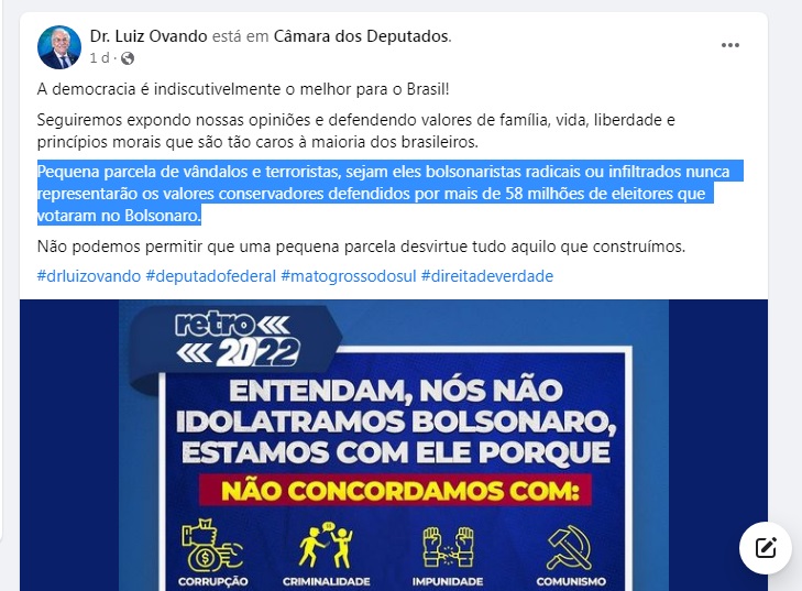 Alguns deles, inclusive, estiveram com manifestantes na frente de quartéis do exército em Mato Grosso do Sul. Desde a invasão em Brasília, alguns dos políticos apagaram posts de incentivo aos manifestos.