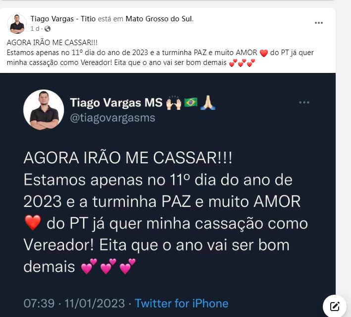 “Agora irão me cassar! Estamos apenas no 11º dia do ano de 2023 e a turminha PAZ e muito AMOR do PT já quer minha cassação como Vereador! Eita que o ano vai ser bom demais”, disse ele.