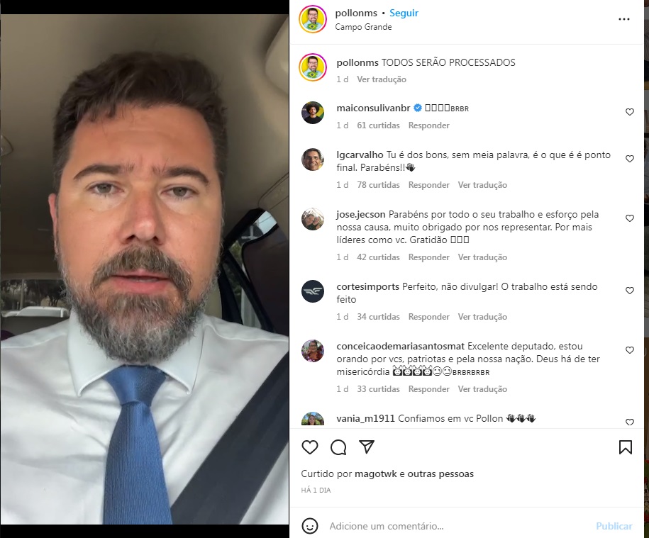 No Instagram, Pollon publicou um vídeo dizendo que irá processar a todos os seguidores que ofenderem os bolsonaristas e disse que apoia manifestação pacifica.