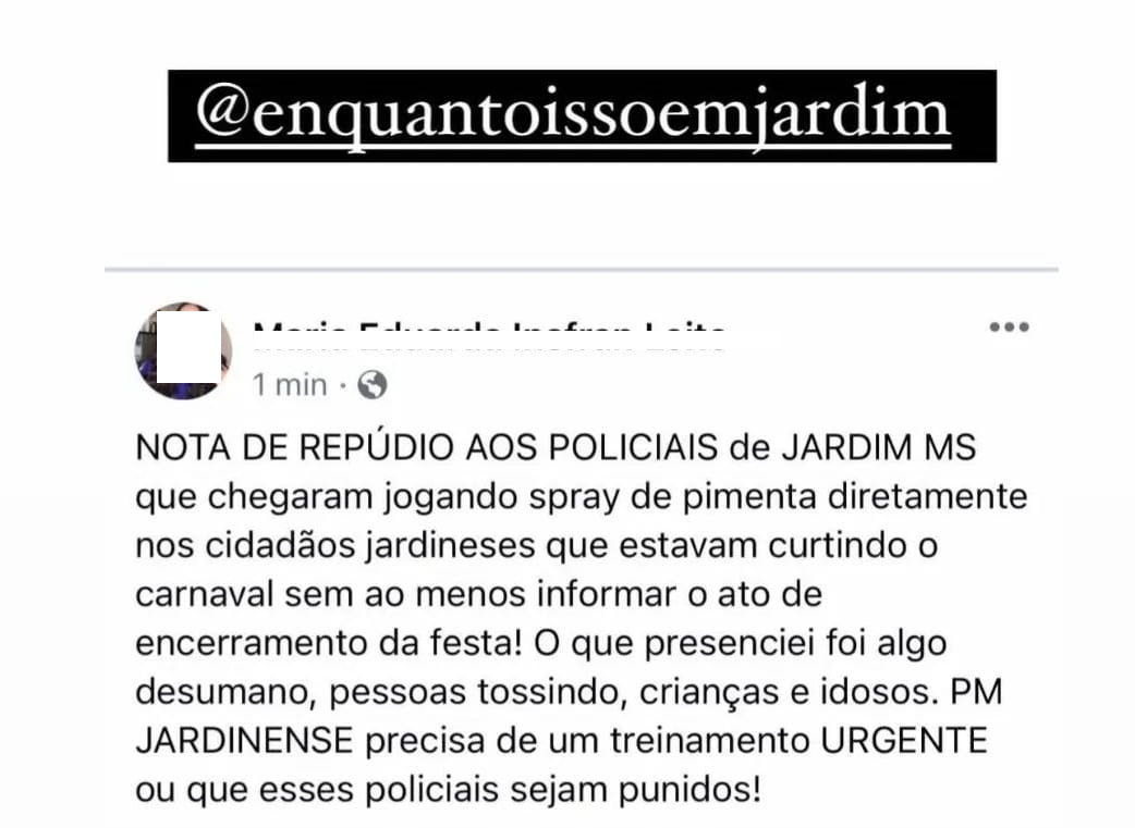 “Nota de repúdio aos policiais de Jardim-MS, que chegaram jogando spray de pimenta diretamente nos cidadãos jardinenses que estavam curtindo o Carnaval, sem ao menos informar o ato de encerramento da festa!”.