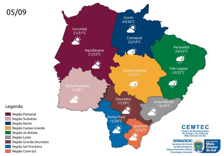 Em Corumbá, na região pantaneira, a mínima será de 21°C e máxima de 31°C; Aquidauana terá variação entre 21°C e 33°C. No sudoeste, Porto Murtinho amanhece com 17°C e atinge os 28°C. No norte, as temperaturas ficam mais elevadas, Coxim terá 24°C cedo e alcançará os 36°C ao longo do dia. No Bolsão, Três Lagoas registra 23°C pela manhã e 32°C de tarde.