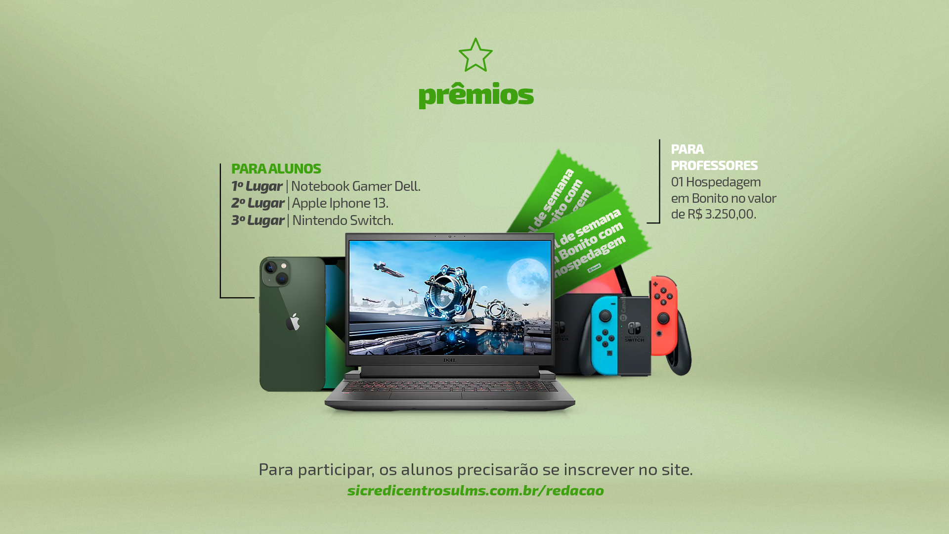 Três melhores redações serão premiadas com Notebook Gamer, Iphone 13 e Nintendo Switch, respectivamente; professor premiado ganhará viagem a Bonito
