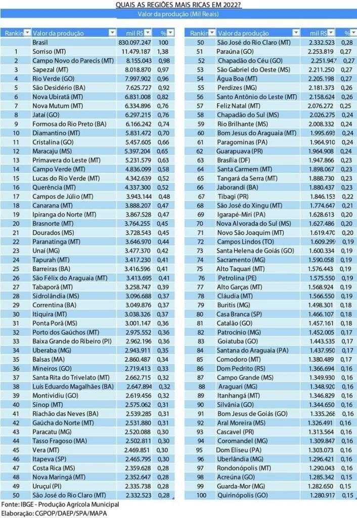 O Ministério da Agricultura e Pecuária (Mapa) divulgou um ranking dos 100 municípios mais ricos do Brasil no agronegócio. Os dados são da pesquisa anual da Produção Agrícola Municipal (PAM) de 2022, que levou em consideração, entre outros quesitos,