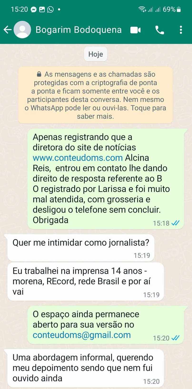 Pra constar segue o Registro de jornalista da Diretora Alcina Reis 1309MS, pois o acusado questionou a veracidade e por fim acaba que cometeu mais uma violência contra mulher, sendo hostil e grosseiro ao telefone.