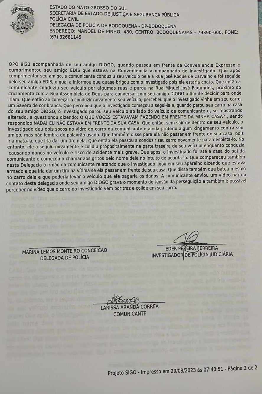 O presidente da Associação Pedal Bodoquena Leandro Bogarim da Silva (36) perseguiu, bateu duas veses e esmurrou o carro ameaçando de morte a gestora do Pólo Unisa de Bodoquena Larissa Aranda Correa(30), conforme consta no boletim de ocorrências e confirmado pela vítima ao site Conteúdo MS.