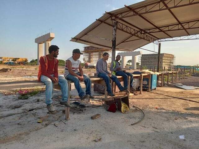 Trabalhadores parados no canteiro de obras da ponte bioceânica. (Foto: Direto das Ruas)