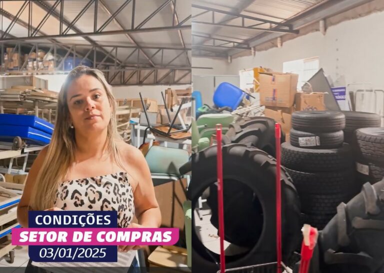 O vídeo mostra que o almoxarifado da prefeitura virou um depósito de entulhos, com diversos móveis e objetos empilhados, inclusive pneus de caminhões. “O local é inadequado, quente para armazenamento”, relatou Niágara, sugerindo o visível risco em caso de incêndio.