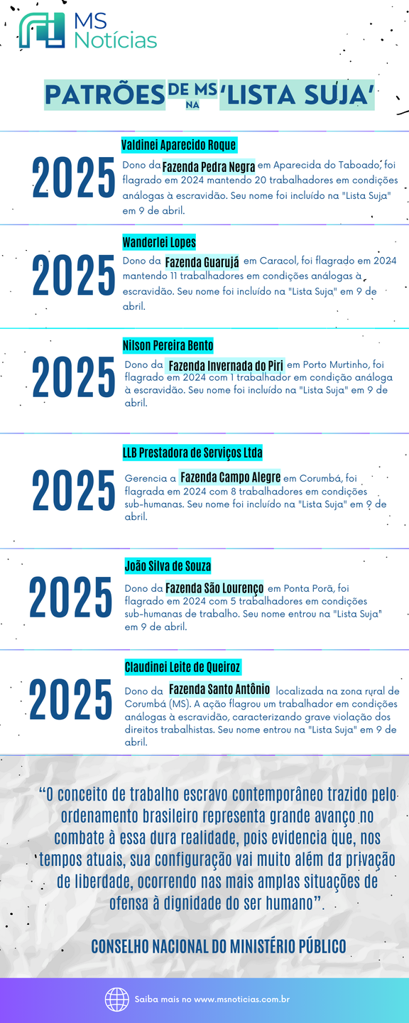 12. Antônio Paulo Mohamed Xavier, proprietário da Fazenda Pousada do Sul, Corumbá, foi flagrado em 2022 com 5 trabalhadores em condições análogas à escravidão. Seu nome foi incluído na "Lista Suja" em 2023 e reafirmado nos anos seguintes.