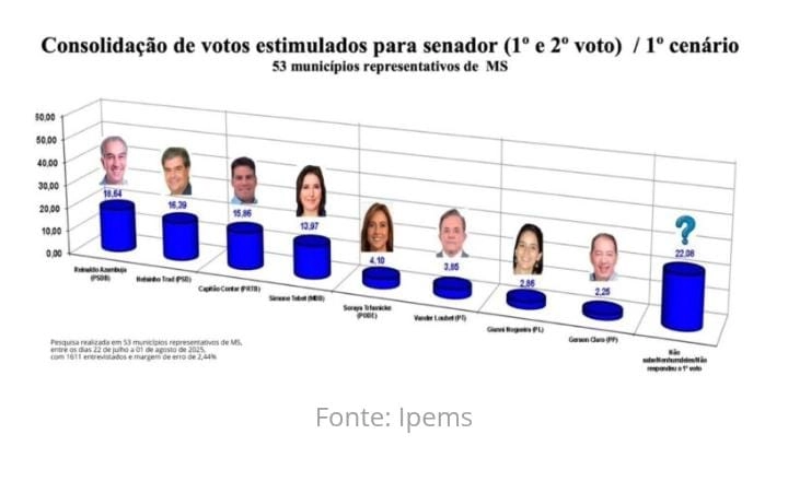 Os números mostram o ex-deputado com 25,52% das intenções de voto, seguido do ex-governador Reinaldo Azambuja, que deve trocar o PSDB pelo PL, com 19,89%. O senador Nelsinho Trad (PSD) teria 15,77%, enquanto a ministra Simone Tebet (MDB) aparece com 15,16%.