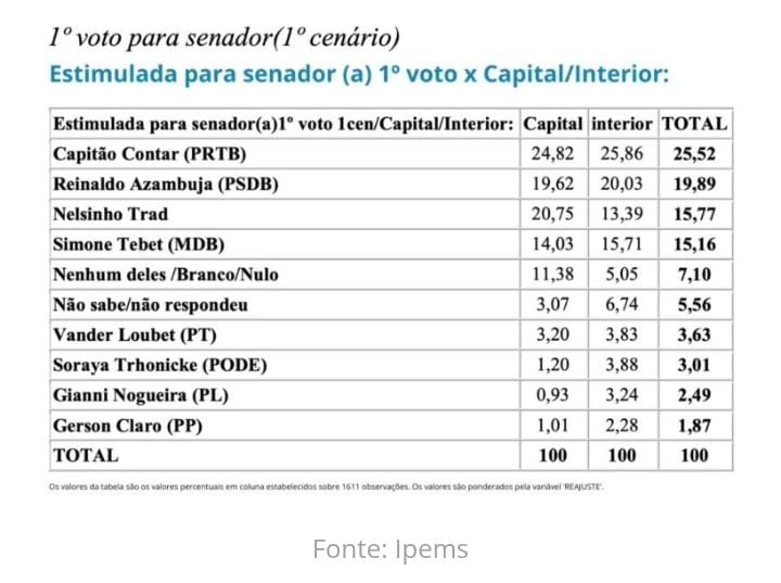 Segundo colocado para governador em 2022, Capitão Contar (PRTB) lidera a disputa pelo primeiro voto ao Senado em 2026, aponta levantamento do Instituto de Pesquisas de Mato Grosso do Sul (Ipems), divulgada terça-feira (5) pelo Correio do Estado. Em 2026, o eleitor poderá votar em dois nomes para o Senado.