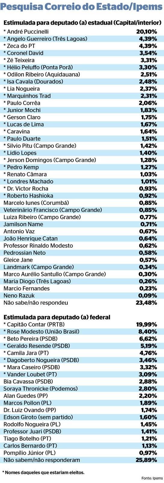 Ainda segundo a pesquisa estimulada, se as eleições fossem hoje, seriam eleitos deputados estaduais o ex-governador André Puccinelli (MDB), com 20,10%, o ex-prefeito Angelo Guerreiro (PSDB), com 4,39%, o deputado estadual Zeca do PT, com 4,39%, o deputado estadual Coronel David (PL), com 3,54%, e o deputado estadual Zé Teixeira (PSDB), com 3,31%.