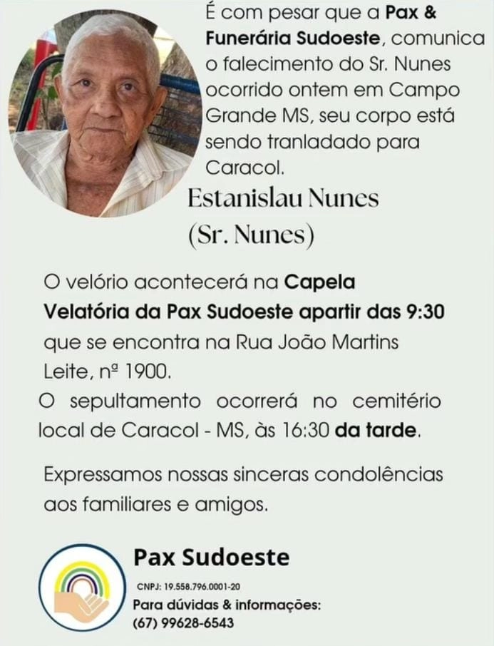 O ex-vereador Estanislau Nunes, morreu nesta Quinta-feira (21) aos 86 anos na capital Campo grande.