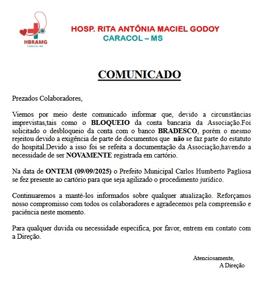 Após dias de atraso devido a erros ainda não esclarecidos, O hospital Rita Antônia Maciel Godoy emitiu um comunicado aos colaboradores.