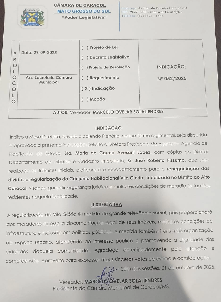 Em um movimento que visa garantir a segurança jurídica e melhores condições de moradia para centenas de famílias, o vereador presidente da Câmara Municipal, Marcelo Solaliendres, apresentou a Indicação 052/2025. O documento solicita à Agehab (Agência de Habitação do Estado) e ao Departamento de Tributos e Cadastro Imobiliário de Caracol a realização dos trâmites para o recadastramento e renegociação de dívidas do Conjunto Habitacional Vila Glória, localizado no Distrito do Alto Caracol.