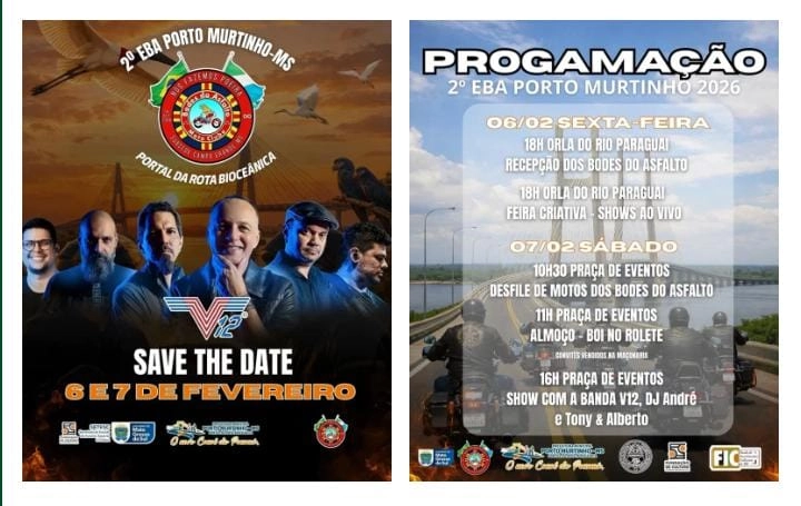 Nos dias 6 e 7 de fevereiro, Porto Murtinho será sede da 2ª edição do EBA – Portal da Rota Bioceânica, evento promovido pela gestão municipal que retorna ao calendário local após sua primeira edição realizada em 2025.